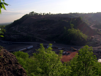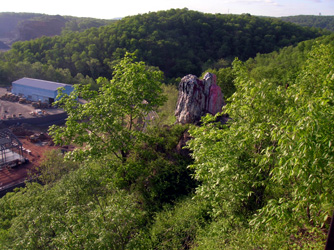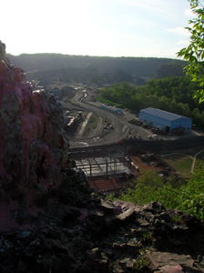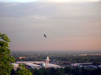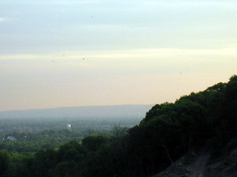 With all this background info, the RR Team had some expectations of weirdness for an expedition in them thar woods. As is usually the case, when the expectations for strangeness are high, the outcomes tend to be small. On the actual Hawk Watch Platform, the Team noted that the “White Rock” was completely discolored by someone”s attempt to paint the rock formation pink and scarlet. There was so much paint dumped on the rocks that it pooled and was still moist and flexible in some crannies, despite the obvious evidence that the “painting” occurred some time much earlier- there were several rusted old cans of paint left in the nearby bushes. The overlook out to the quarry was fantastic though, and we definitely caught great views of some really huge hawks swooping down at sunset. Of course, some of the swooping aerial juggernauts proved to be big bats getting their evening meal, but it really is an excellent vantage point for bird watching.