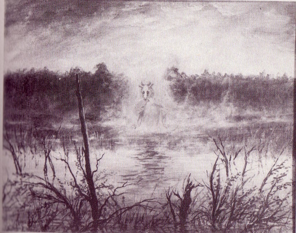 The couple did not report the incident to the police and felt wary about even re-telling the incident to family and friends. “It sounded so crazy, but we both saw the same thing, we know what we saw and yet we doubted that anyone would believe us” the couple continued. The couple never even thought of their encounter as a “Jersey Devil” sighting until about 25 years later when their son, Kenny, showed them the book, The Jersey Devil by James F. McCloy and Ray Miller Jr. about the legendary creature that has purportedly haunted New Jersey for over 250 years. When Janet began to look at some of the pictures, she knew that both her and Frank were not the only people to have ever had an encounter with this creature… “As soon as I saw the one picture, the painting with the creature rising out of the mist and water, I knew that was exactly what we had seen”. Frank also felt that this painting was an accurate physical depiction, especially as it captured the “glowing bony, horsy type of head and hooves the creature that we saw had”.